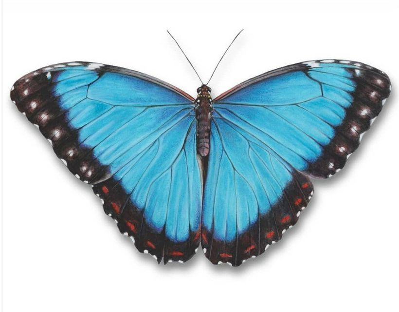 Técnica de puntillismo en tinta. Acuarelas vibrantes. Ilustración en vivo de una Morpho Azul.